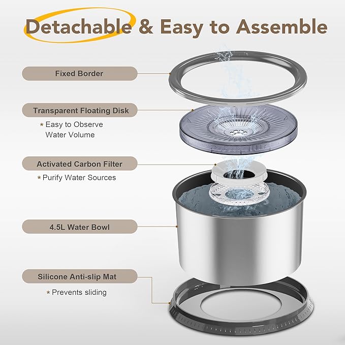 - Easy to Clean: The removable floating disk combined with the filter made of non-woven fabric, activated carbon and ion exchange resin can filter the water layer by layer to remove impurities hair and other fine particles, deeply purify the water and provide clean, fresh water. We recommend disassembling and cleaning the floating disk at least twice a week and replacing the filter every 2 months