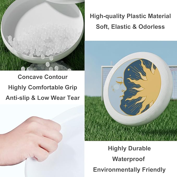 - 2.Material: This Sun And Moon Ultimate Disc is made of polyethylene which is a high-end plastic that has excellent grip for consistent throws and not easily damaged when hitting walls or concrete floors