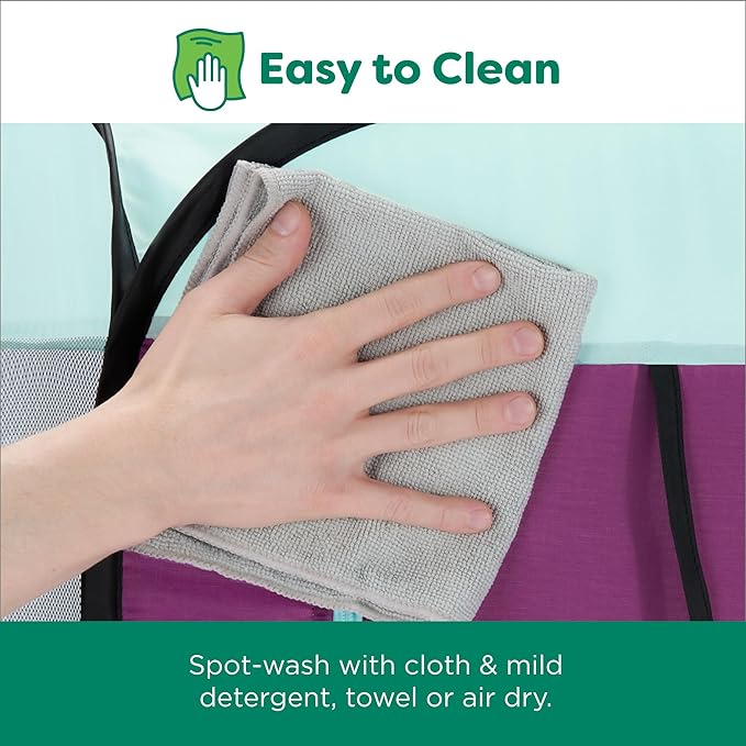 - PERFECT FOR TRAVEL: The playpen's pop-up design ensures that it can be set up, and put away, within seconds; the tent also comes with small metal stakes used to secure it to the ground, making it an ideal outdoor accessory for camping and picnics