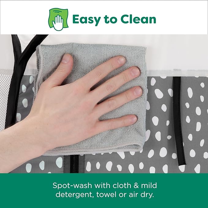 - PERFECT FOR TRAVEL: The playpen's pop-up design ensures that it can be set up, and put away, within seconds; the tent also comes with small metal stakes used to secure it to the ground, making it an ideal outdoor accessory for camping and picnics