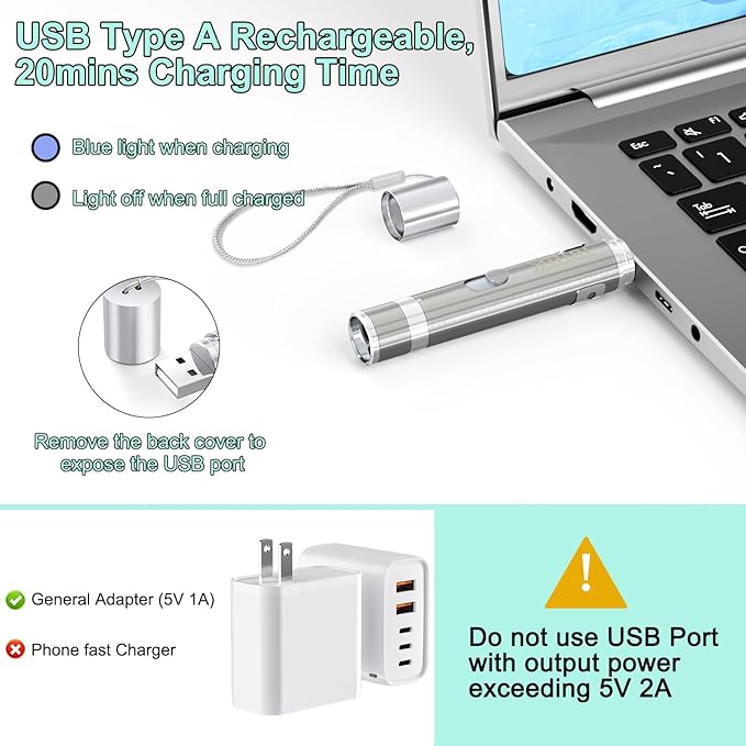 - USB Direct Charging: No dry batteries needed! Unplug the back cover and plug into USB port (adapter/computer/car) to charge, about 20mins fully charged.