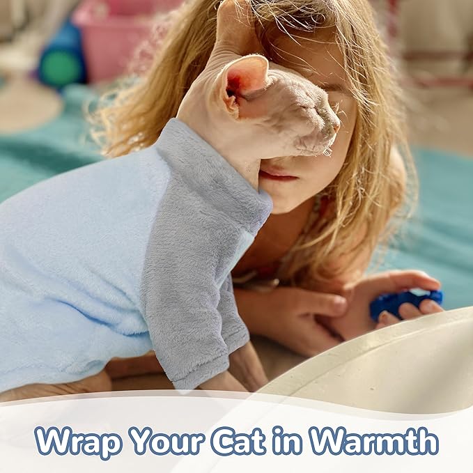 PUMYPOREITY Turtleneck Sweater for Sphynx Cat, Soft Coral Fleece Cat Clothes, Thick Winter Warm Outfit Coat with Sleeves, XS, Blue