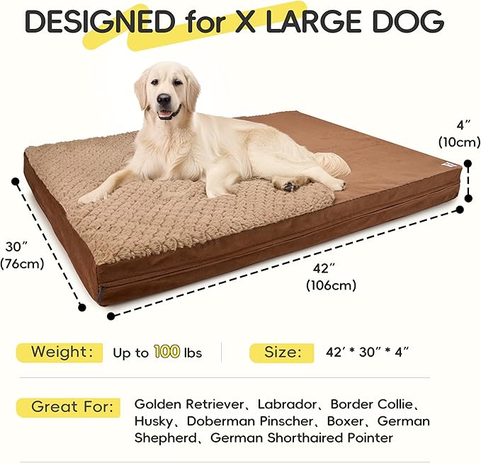 - 🐕 【Spacious X-Large Size for Medium and Large Dogs】 Measuring 42"x30"x4", our X-Large dog bed is tailored for medium to large dogs up to 100 lbs, such as Labradors, Golden Retrievers, and German Shepherds. Treat your furry friend to a spacious, comfortable place to relax and unwind.