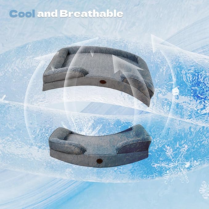 - Comfort & Smart Desigend: Our Cooling Pet Bed features a 4-sided bolster design, fostering a heightened sense of comfort and security for your furry friend. The bolster's generously cushioned shape is generously filled to provide ample support for your pet's head and neck, leading to a more peaceful slumber. Additionally, the thoughtfully lowered entrance safeguards your pet's knees and facilitates easy access.Its non-slip bottom ensures durability while preventing slipping accidents.
