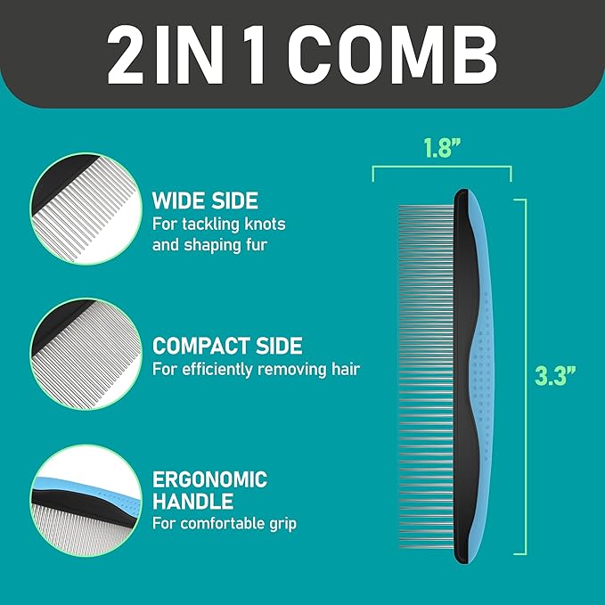 - DUAL-SIDED DESIGN: Our grooming brush is perfect for dematting and deshedding your pet's coat! With a dual-sided design, use the 9-teeth side to tackle stubborn mats and tangles and the 17-teeth side to thin out and deshed your pet's fur.