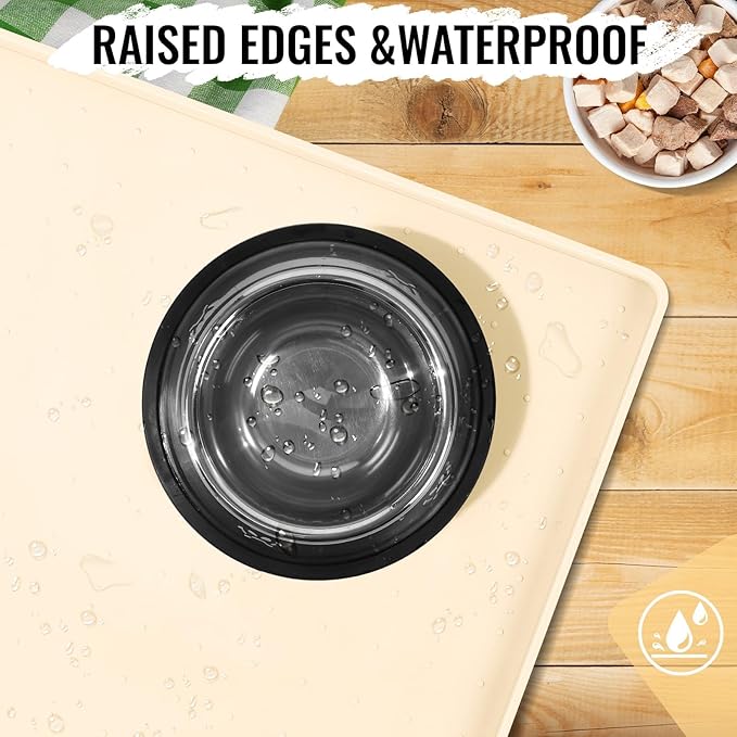 MateeyLife Dog & Cat Food Mat for Floors Waterproof, Nonslip Pets Bowl Mats for Dining and Drinking, Dogs Feeding Mats with Raised Edges, Silicone Cats Matt Tray for Messy Drinkers, 24"x16", Beige