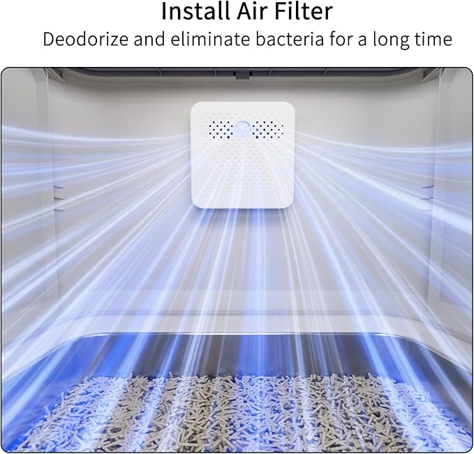 - Sterilization & Deodorization: This litter box adds a deodorizing filter, which can remove odors from the box and sterilize the air, which can keep the air in the litter box fresh and bring a more comfortable and safe living environment for cats. The deodorizer can be charged by USB, convenient and durable.