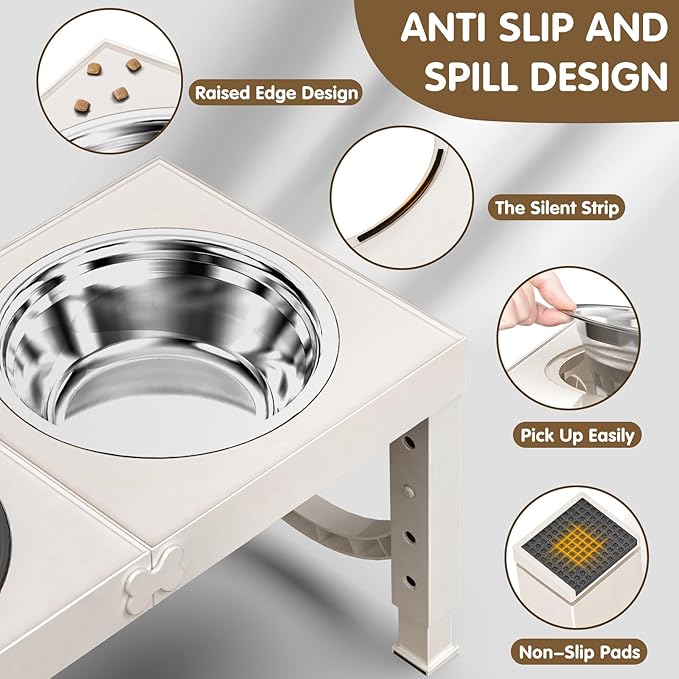 - ANTI-SLIP QUIET DURABLE: The non-slip pads and the silent strip on the white elevated dog bowl stand, prevents it from being accidentally knocked over by your dog, but also ensures that the bowl and stand stay stable even during vigorous eating. Avoid daily hassle of cleaning up the floor after your dog's meal!