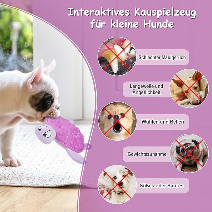 - Interactive playtime : The squeak, crinkle, and rattling paper sound devices in this toy will keep your small dog entertained and engaged during playtime, helping to relieve anxiety and keep them busy.