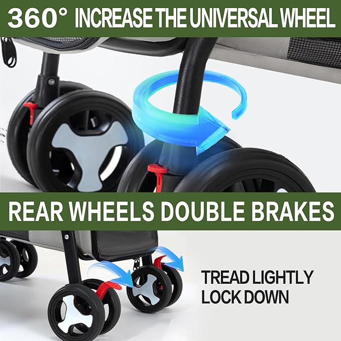 Pet Stroller Double Deck 4 Wheels - Easy-Fold Dog Cat Stroller for Small Medium Dog Cats Carrier, Travel Folding Carrier Breathable and Visible Mesh with Cup Holder(Gray)