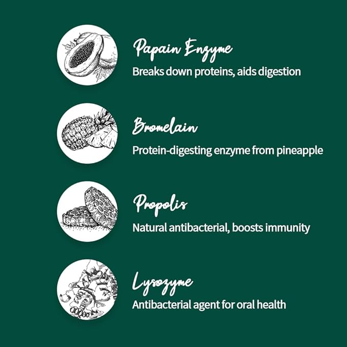 - Oral Microbiome Support – Probiotics and enzymes help balance mouth flora, reducing plaque and tartar naturally for healthier teeth and gums.