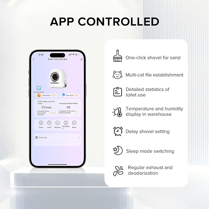 - Track Your Cat's Health: Four gravity sensing technologies and a powerful motor system of our self cleaning litter box automatically track your cat's data, including monitoring weight, toilet usage and humidity and temperature inside the auto litter box, Get to know your pet better with our self-cleaning litter box