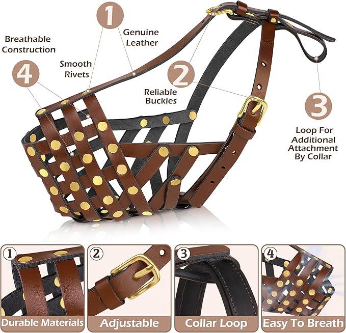 - Universal Fit for Large Breeds: Designed for a perfect fit, this leather anti-bark basket muzzle is ideal for Labrador, Golden Retriever, Flat-Coated Retriever, Boxer, American Bulldog, English Bulldog
