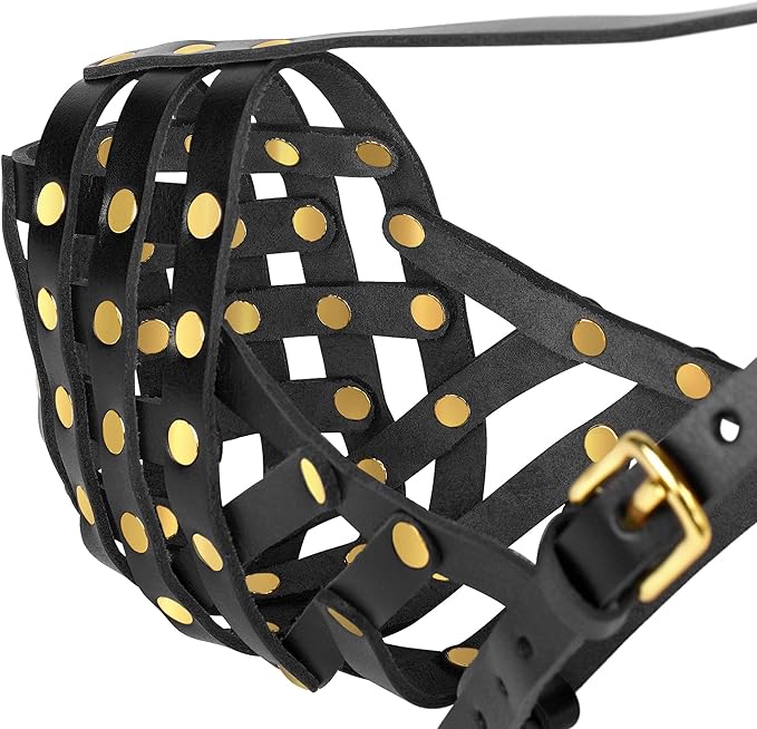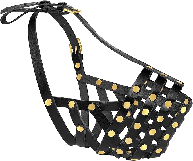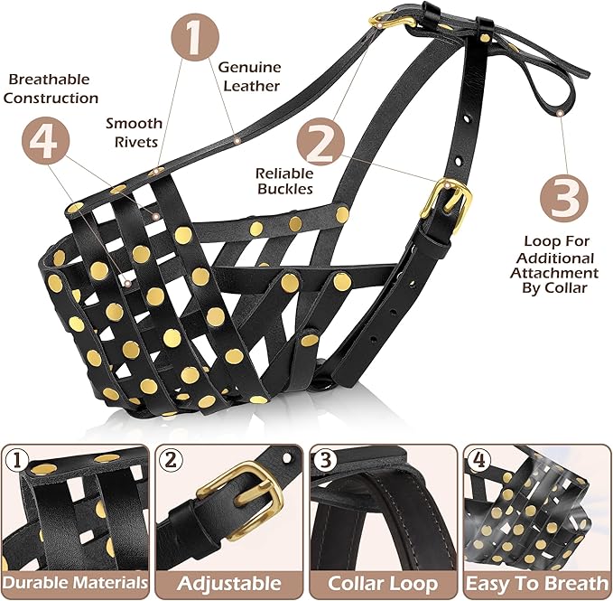 - Materials: Crafted from premium genuine leather with stainless-steel rivets, our cage muzzle ensures safety and durability for large dogs. The adjustable leather straps provide a secure, comfortable fit, preventing slipping during use.