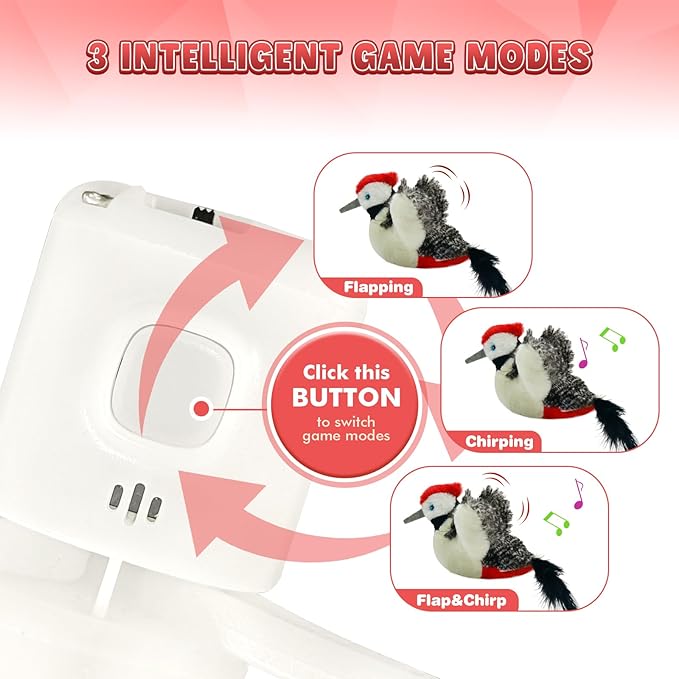 Cat Toys, Flapping Wings Woodpecker, No Flying, Chirping Bird Interactive Catnip Toy for Kitten or Small Dogs, Touch Activated, Rechargeable, 3 Modes