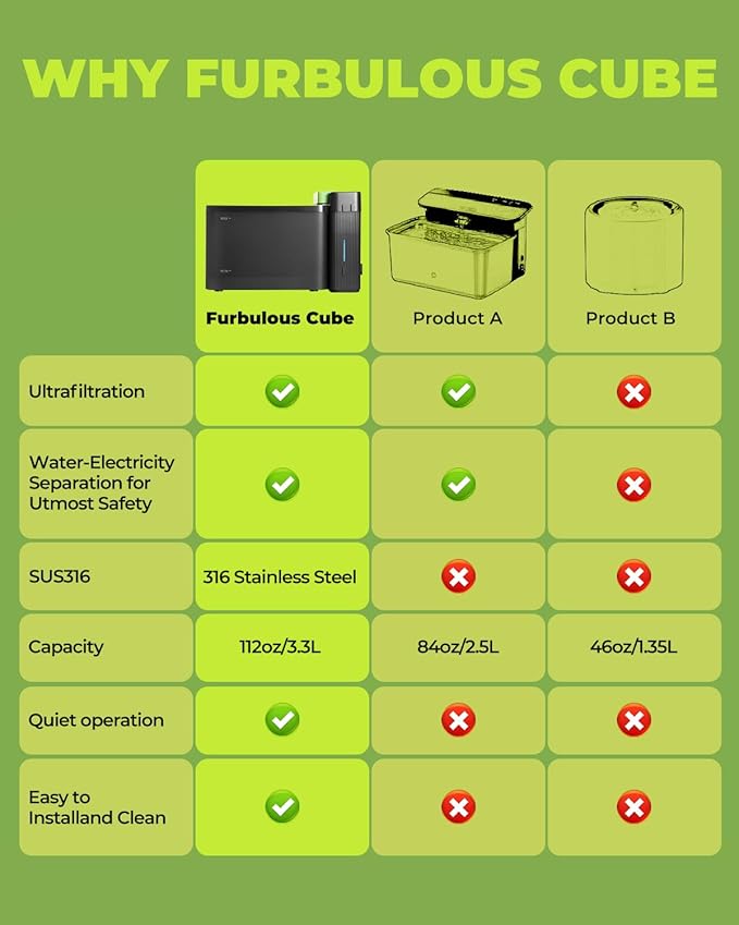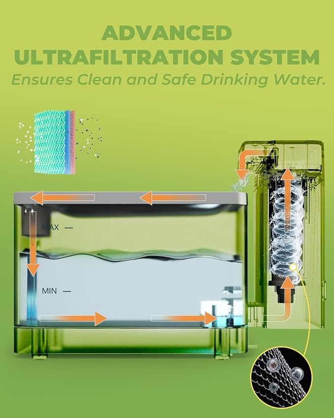 - REAL ULTRAFILTRATION SYSTEM: Ensures True Clean-Drinking water by filtering out impurities, particles, and odors more than 0.01 microns, promoting your pet's health. (Tip: Alter replacing the UF filter, Press&Hold the button for 5s to reset the red light to green, confirming the filter is functioning)