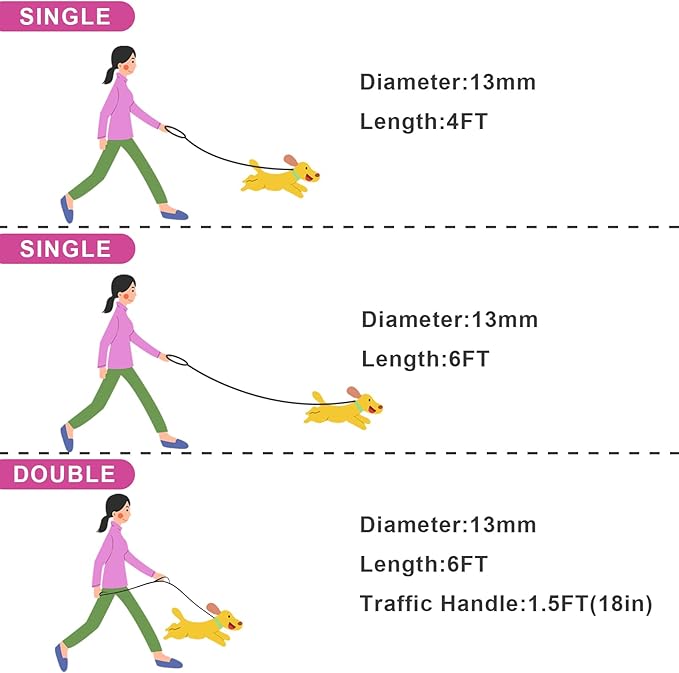 - 【Double Handle】Dog Leash with traffic handle gives you more control over your dog, and guide it through busy and crowded areas with ease. It offers an extra level of safety for your furry friends in an emergency situation. Our 6ft standard dog leash handle is great for walking, running, hiking or training, and is a perfect balance between freedom and control.