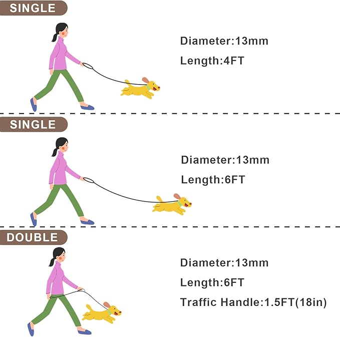 - 【Double Handle】Dog Leash with traffic handle gives you more control over your dog, and guide it through busy and crowded areas with ease. It offers an extra level of safety for your furry friends in an emergency situation. Our 6ft standard dog leash handle is great for walking, running, hiking or training, and is a perfect balance between freedom and control.