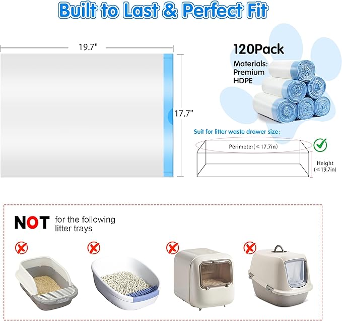 - Compatibility: Litter box bags, measuring 17.7" x 19.68", are designed to be compatible with various models including MeoWant MW-SC01,MW-SC02, SUW,Furrytail,PetCove,ABRCT,Jorbasado,LELO ELVES,Cawypety,LELOKIDZ,DOEL,HHOlove,NBBX,Mintakawa. Ensure a proper fit by referring to the provided images.