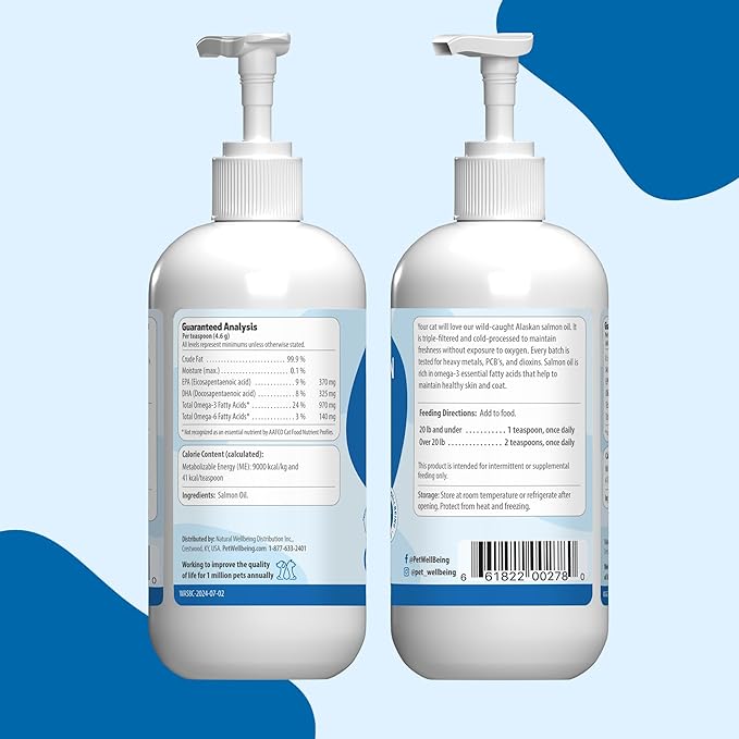 Pet Wellbeing Wild Alaskan Salmon Oil for Cats - Wild-Caught, Cold-Processed, Daily Omega-3 Fish Oil for Healthy Coat and Skin, Joint Mobility and Strength - EPA, DHA - 8 fl oz (236 ml)