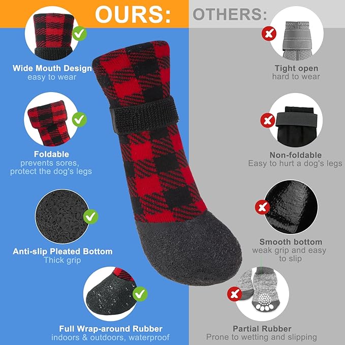 - ANTI-SLIP & WATERPROOF: Our dog boots are surrounded on all sides by a pleated durable rubber underneath, which provides a stronger grip and is more slip resistant. Our pet paw protector socks are very friendly to both puppies and older dogs. These anti-slip dog socks can be worn as dog boots, on wooden floors, indoors and outdoors.