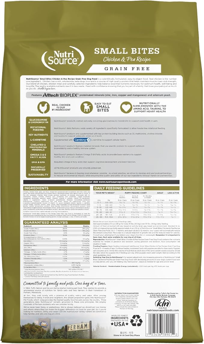 - As a member of our grain free series, NutriSource Chicken and Peas Small Bites Dry Dog Food is formulated to meet AAFCO guidelines for all lifestages