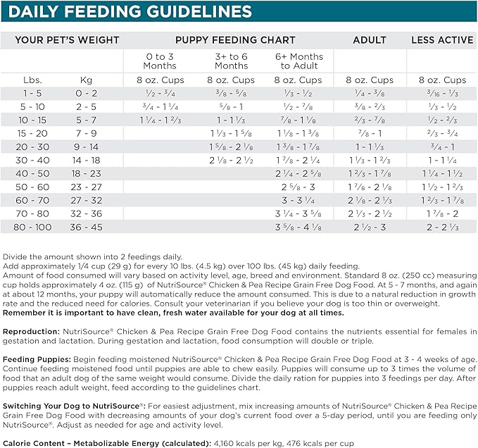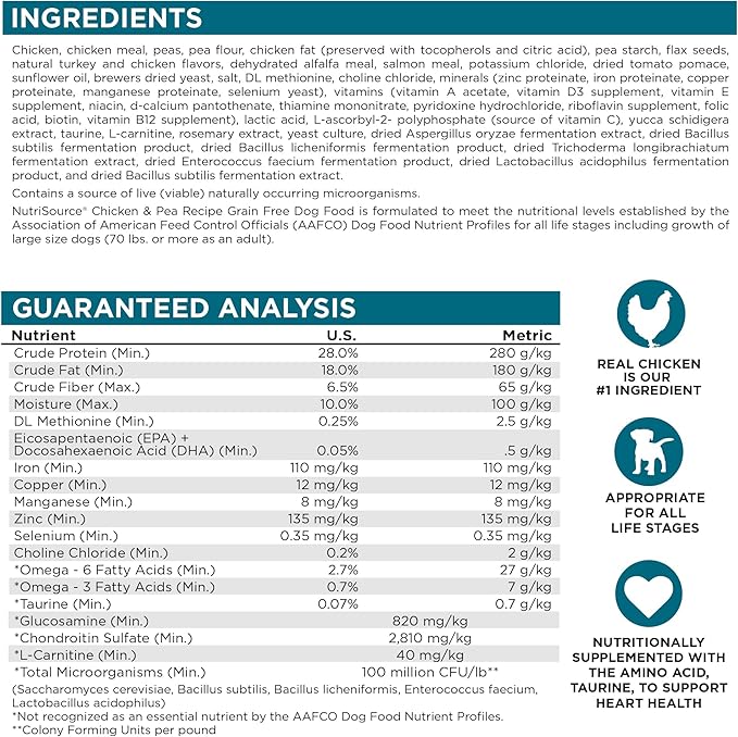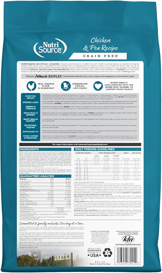 - As a member of our grain free series, NutriSource Chicken and Peas Dry Dog Food is formulated to meet AAFCO guidelines for all lifestages
