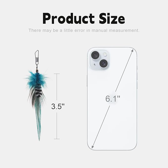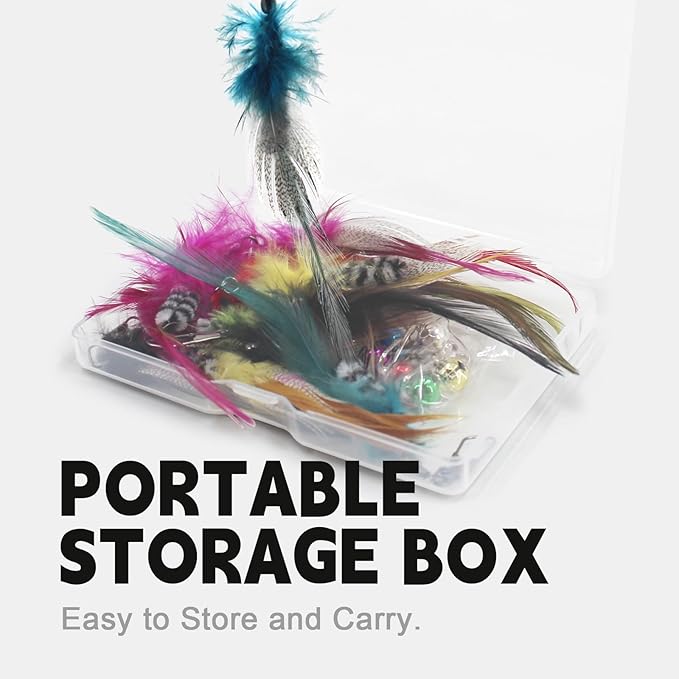 - [EASY STORAGE AND COMPATIBLE] All the cat toy wand refills were in a storage box, which is very practical. You can also use it to store similar small items. Each cat feather toy replacement is equipped with a clasp that works with any cat rod with an eyelet hook connector. It can also be hung to any place you want for your cat to play with, bring more play options and fun to cats