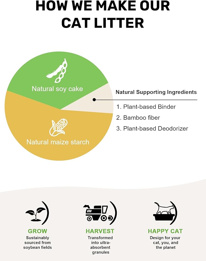 - Natural Plant-Based Formula - Crafted from premium soybean dregs, corn starch, and bamboo fibers. 100% biodegradable and water-soluble, it dissolves in 30 seconds and composts within 6 months. For sensitive cats and eco-conscious homes.