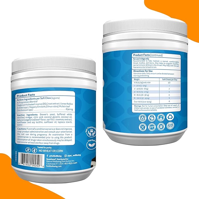 - 𦴠CONVENIENT CHEWABLE THROAT SUPPORT - Veterinarian-formulated herbal blend in delicious chewies that dogs love. Same powerful upper respiratory support as our liquid formula, now in a convenient soft chew format for easy daily administration and travel.