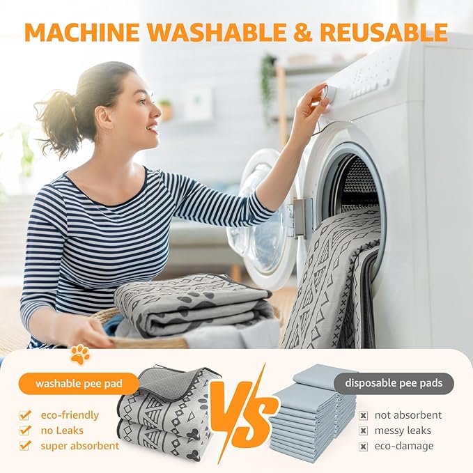 - Reusable: Compared to disposable pads, our washable puppy pads remain highly absorbent and soft even after multiple machine washes, ensuring long-lasting durability. This design reduces waste and provides pet owners with a more economical and convenient option