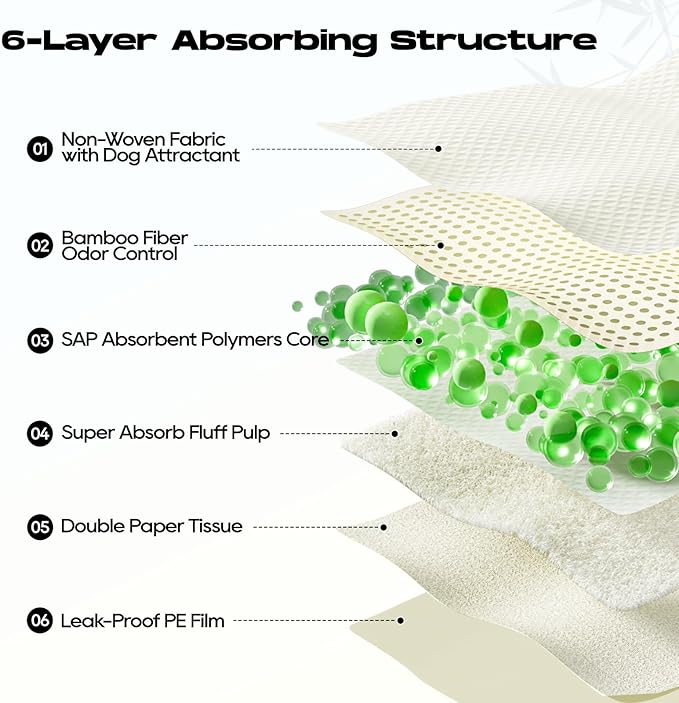 - 🦴【Super Absorbent & Quick Drying】6 layers of protection designed with polymers for super absorbency,converting liquid to gel in seconds for easy cleanup and staying dry.The non-woven fabric of the diaper pads accelerates liquid absorption and prevents reverse osmosis,keeping the surface dry quickly