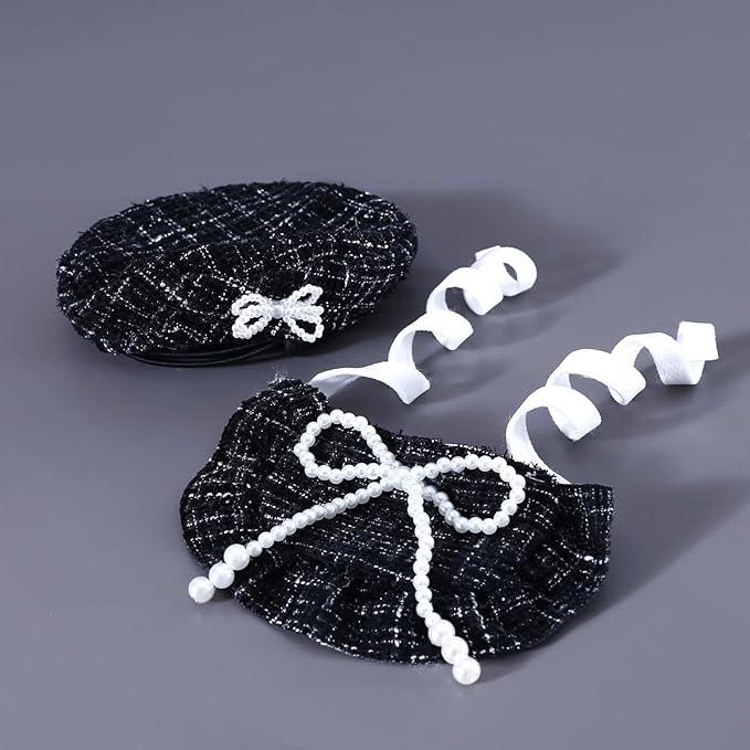 HOWWFALY 2PCS Cat Beret Hat with Pearl Bowtie, Adjustable Bandana Scarf Set Pet Princess Costume for Halloween Christmas, Cat Dog Birthday Party Apparel(Black Pearl)