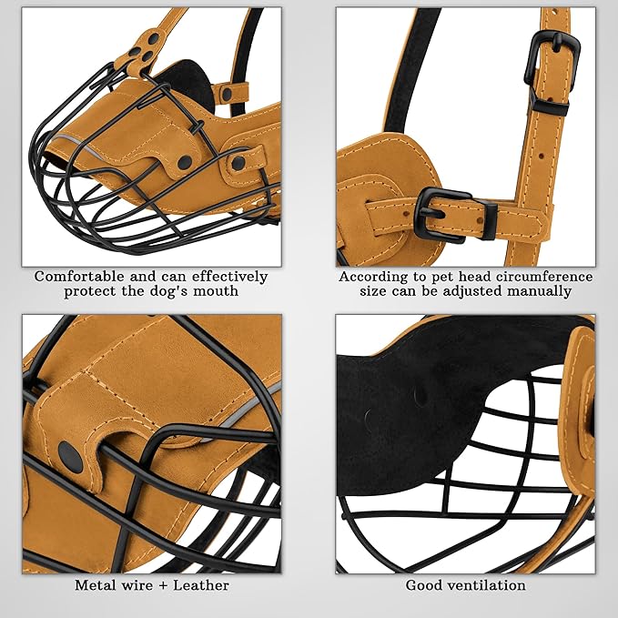 - Adjustable Leather Straps: Featuring adjustable leather straps, this basket muzzle ensures flexibility, secure fit, and enhanced visibility in low-light conditions for added safety during evening walks. The metal construction keeps it securely in place without being easily dislodged.