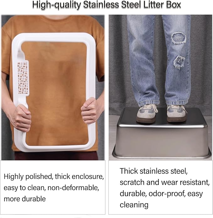- Highly Polished, Glossy Litter Box: The lid and stainless steel are very thick, scratch-resistant and durable, the surface is very smooth, does not retain odor, does not stick, and is very easy to clean.
