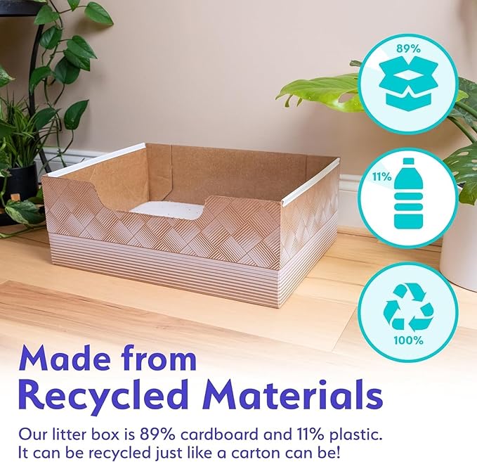 - Eco-Friendly: Did you know plastic can take up to 1,000 years to decompose in a landfill? Sustainability is a priority for us, which is why our litter boxes are made from recycled materials and designed to be recycled after use. Simply dispose of the used litter, fold up the box, and place it in your recycling bin.