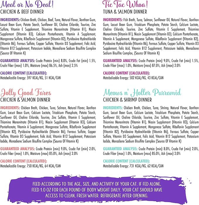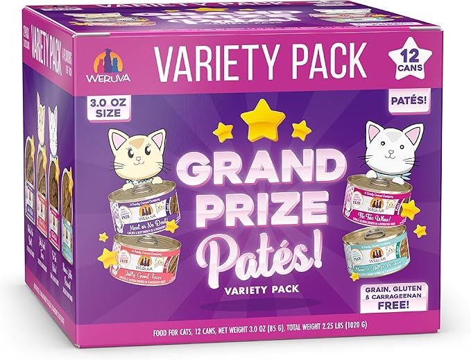 - Weruva Wet Cat Food, Grand Prize Patés Variety Pack 3oz, Pack of 12 includes three (3) of each: Meal or No Deal, Tic Tac Whoa, Jolly Good Fares, Meows n' Holler Purramid.
