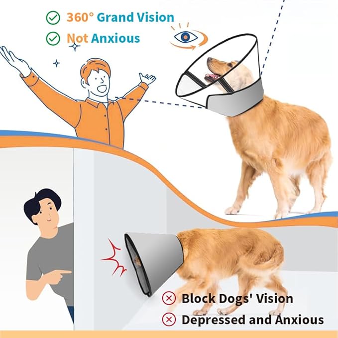 - Clear Edge Visibility: To help reduce your dog's anxiety, we've designed the dog cone collar with a clear PVC edge; Thiscone for dogs allows your dog to maintain their peripheral vision, making the healing process less stressful and confusing for them