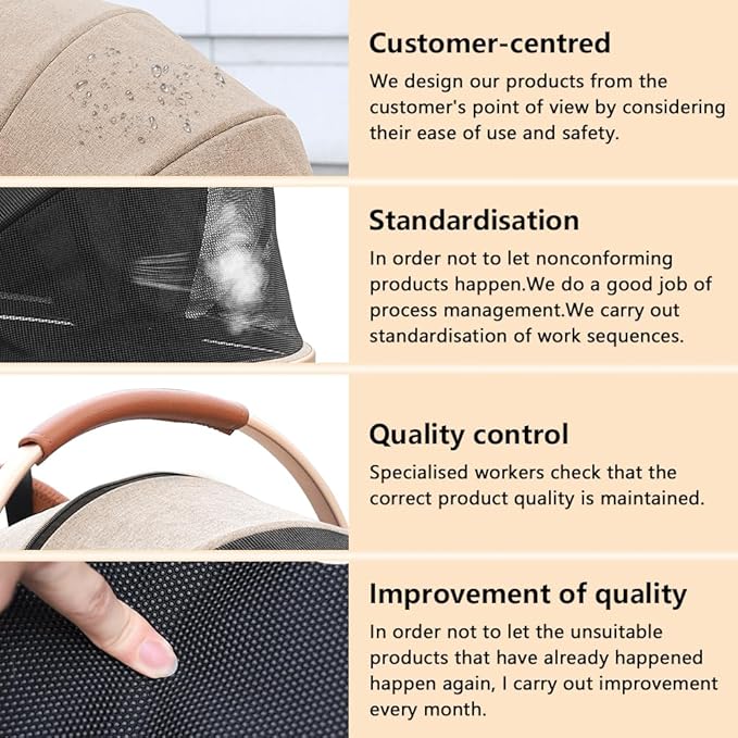- SAFETY AND RELIABILITY: The four wheels are made of durable PU material to suit all occasions. The pushchair has large wheels and the front wheels can swivel 360Β°, these wheels not only ensure durability but also provide smooth and quiet operation. Whether you are walking on the sidewalk or on rough ground, our pet stroller will provide a comfortable and pleasant experience for your pet.