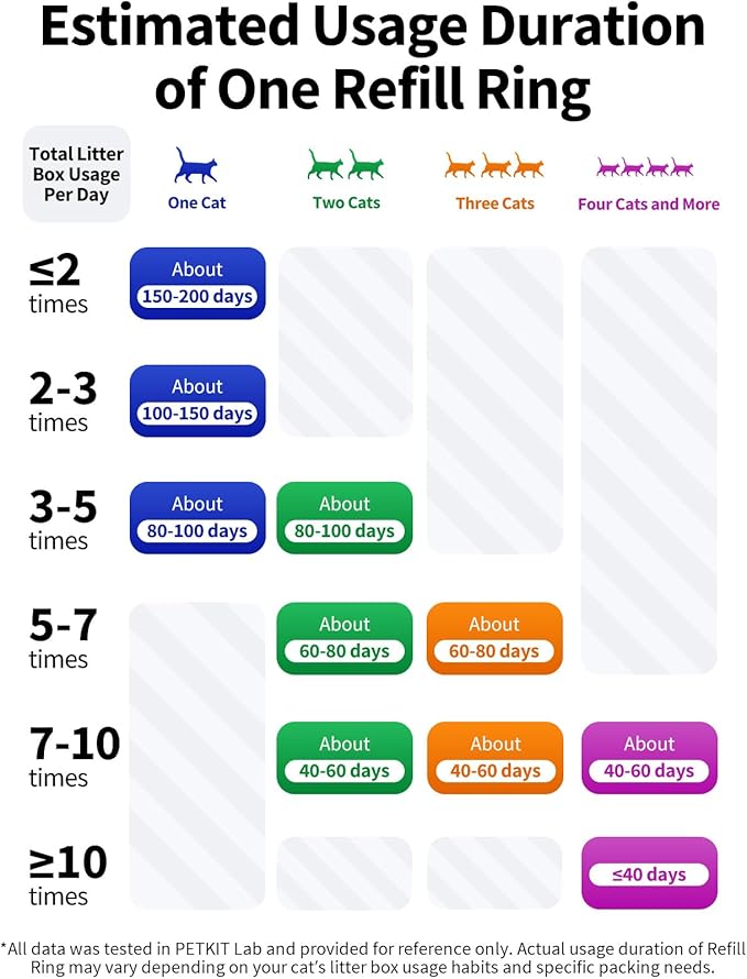 - Long-lasting Refill Bag: Each refill ring can pack approximately 10 times, and the waste bin can hold one catโs waste for up to 20 days. Please Note: The actual frequency may vary based on your cat's litter box usage habits and specific packing needs.