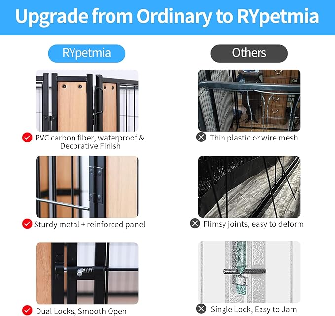 - 【Robust and Aesthetic Structure】Constructed from sturdy metal components, our puppy playpen is built to last, resisting damage from small pets while enhancing its longevity. The design is not only strong but also aesthetically pleasing, blending seamlessly with your home decor. Rounded edges safeguard your pets against scratches, ensuring their safety within the enclosure.