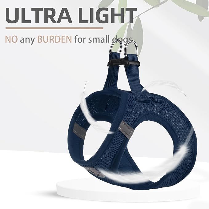 - COMFORTABLE MATERIAL, DAILY WALKING, FOUR SEASONS WEARING: - The harness is made of durable polyester, and it's adopted with an air-mesh design. The whole harness is very soft, lightweight, and breathable. Even if your dog wears it all day, he won't feel any discomfort. For daily walking or running, it is a very easy thing to do. Besides, this is a four seasons harness, it keeps the dog cool on hot days and keeps the dog warm on cold days
