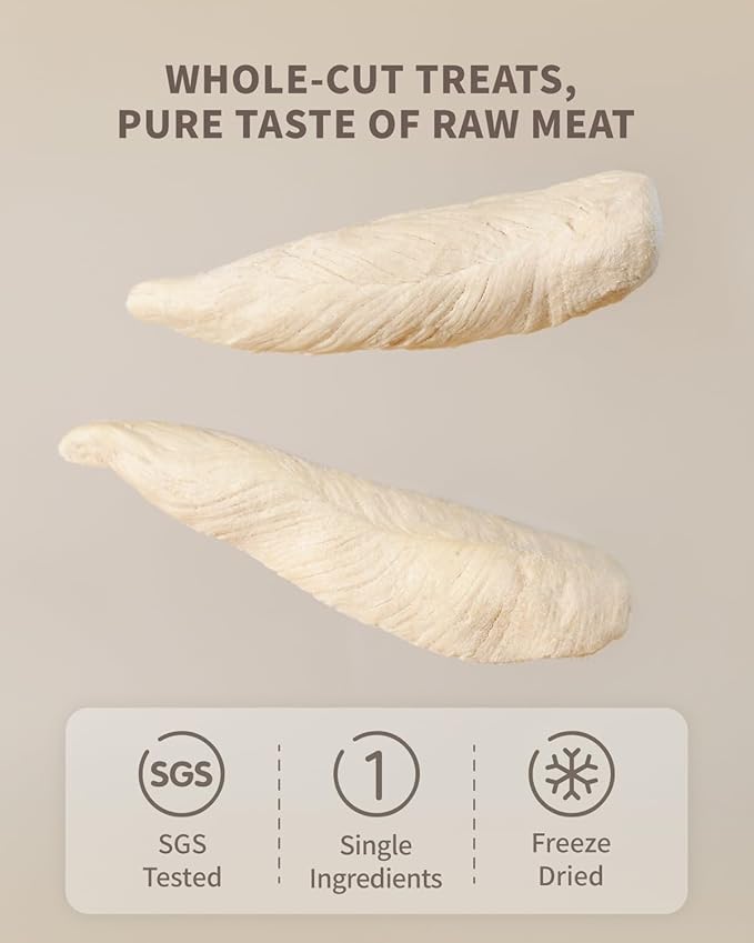 - 【100% Natural, Single-Ingredient】Made from whole-cut chicken breast and nothing else—no additives, fillers, or by-products. These freeze dried dog/cat treats are minimally processed to preserve natural nutrition, making them a perfect guilt-free snack for your furry companion.