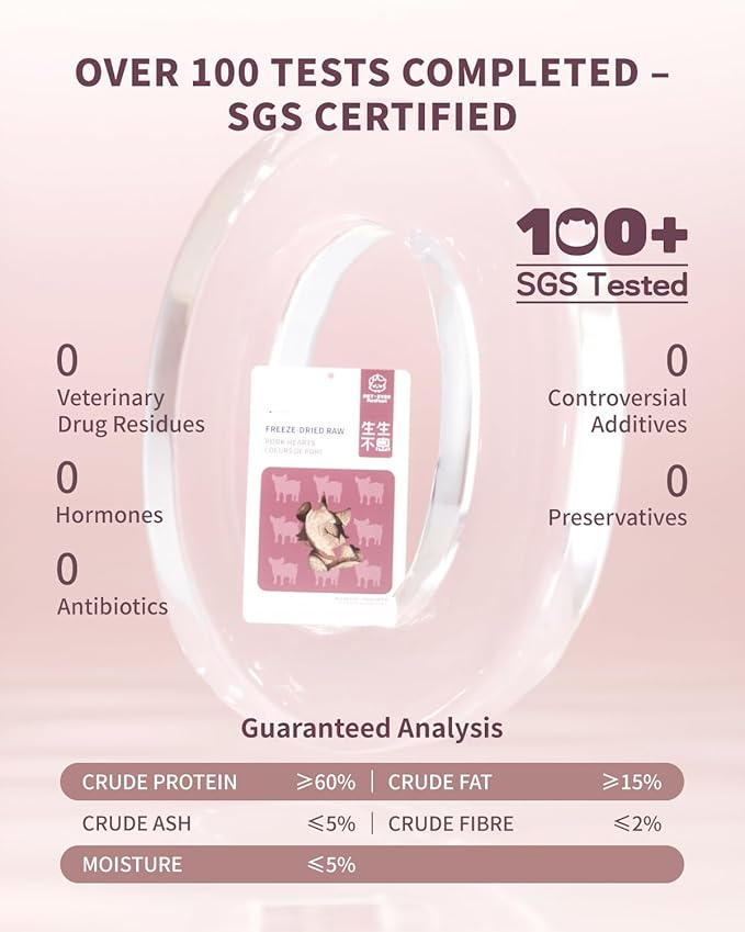 - 【100% Natural, Single-Ingredient】Made from whole-cut pork heart and nothing else—no additives, fillers, or by-products. These freeze dried dog/cat treats are minimally processed to preserve natural nutrition, making them a perfect guilt-free snack for your furry companion.