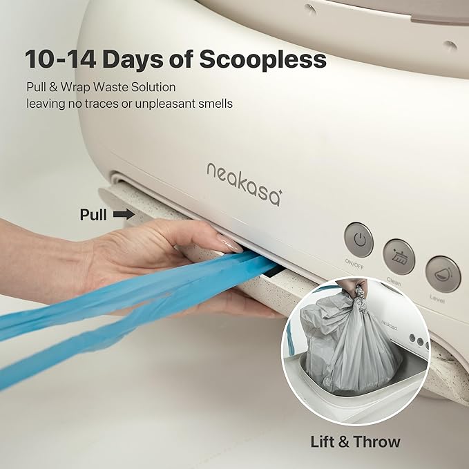 - Pull & Wrap Waste Solution: Pull & Wrap Waste Solution: Neakasa M1 Lite smart design ensures a seamless, odor-free experience. A quick pull securely wraps the trash bag, leaving no traces or unpleasant smells. Say goodbye to frequent cleaning and strong odors, and embrace feline comfort and cleanliness, enjoy 14 days of scoop-free.