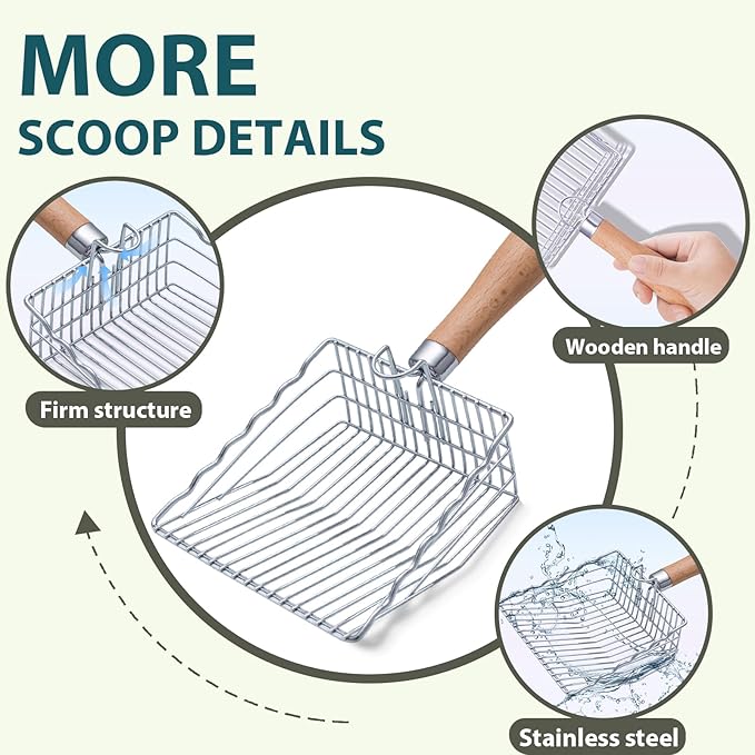 - 【High Quality Materials】: Our cat litter scoop is made of high quality corrosion-resistant stainless steel material, the wooden handle is more comfortable to hold than plastic handle and lasts longer, reducing the cost of frequent replacement