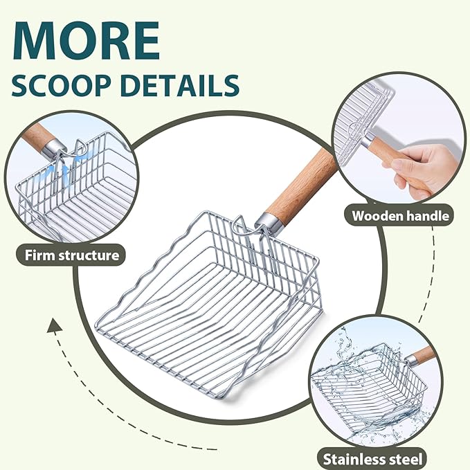 - 【High Quality Materials】: Our cat litter scoop is made of high quality corrosion-resistant stainless steel material, the wooden handle is more comfortable to hold than plastic handle and lasts longer, reducing the cost of frequent replacement