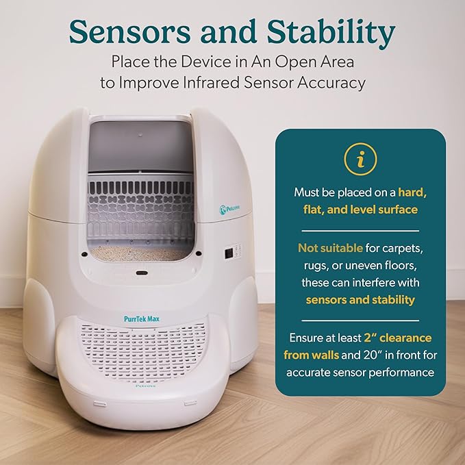 - 【Advanced Safety Features】 Equipped with 5 infrared sensors, child lock, and auto-pause if a cat approaches—PurrTek Max ensures every cleaning cycle is safe for curious cats and peace of mind for owners.