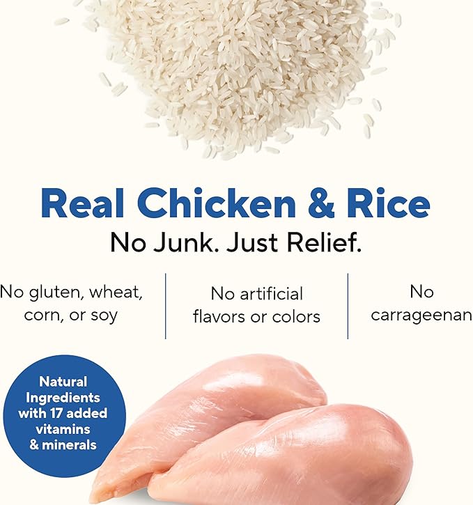- A simple chicken and rice recipe that’s formulated to help calm your furry friend’s tummy during times of transition; also ideal for the pup prone to stomach upset or sensitive stomachs