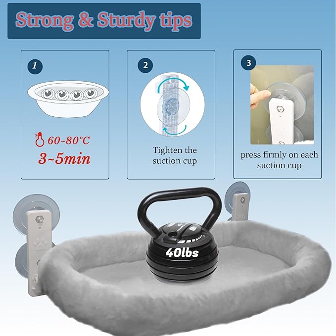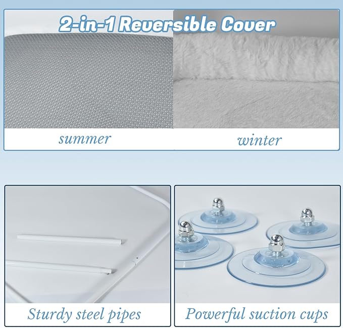 - 【4 strong suction cups + solid metal frame】 - stable and durable! The suction cups lock tightly on smooth windows, holding up to 40lbs (suitable for most cats). The heavy-duty metal frame won’t bend or break, even if your cat jumps on/off quickly. No risk of falling—give you peace of mind.